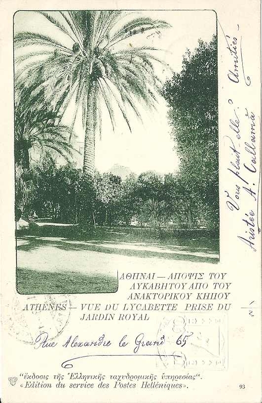 Lot1386 - Επιστολικό Δελτάριο Ιπτάμενου Ερμή 5 λεπτών ταχυδρομημένο, Αθήνα άποψη Λυκαβητού από τον Βασιλικό Κήπο, αριθμός 93