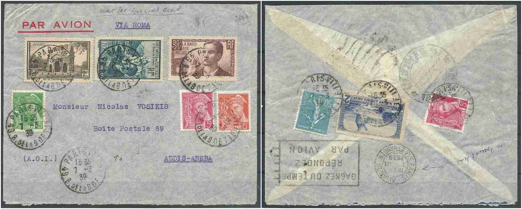 Lot1798 - Γαλλία 1939, φάκελος ταχυδρομημένος Παρίσι-Addis Abeba δια μέσου Ρώμης, Par Avion ✉