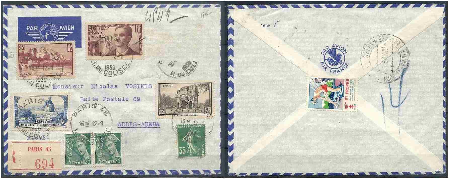 Lot1799 - Γαλλία 1939, φάκελος ταχυδρομημένος συστημένος Παρίσι-Addis Abeba με βινιέτα και σφραγίδα Par Avion Air France ✉