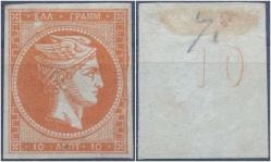Lot0081 - ΕΛΛΑΔΑ 1862-1867 10 λεπτά κίτρινο πορτοκαλί σε πράσινο χαρτί (yellow orange on green), πολύ σπάνιο δεν αναφέρεται στους καταλόγους *