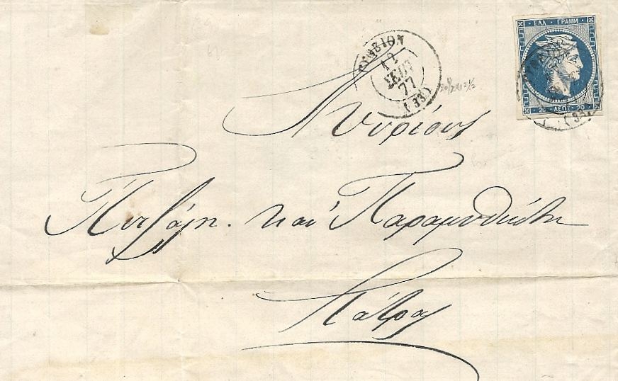 Lot0255 - ΕΛΛΑΔΑ 1875-1880 γράμμα από Γύθειο για Πάτρα με 20λεπτο μπλε πρωσσικό ανοιχτό σε λευκό χαρτί ✉