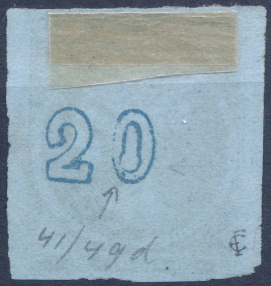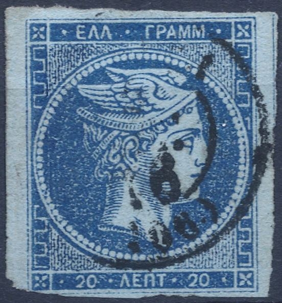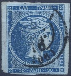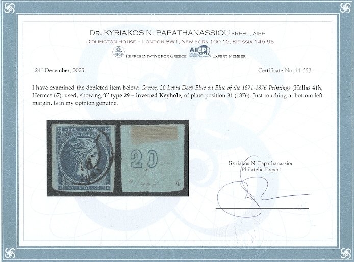 Lot0198 - ΕΛΛΑΔΑ 1871-1876 20 λεπτά μπλε σε μπλε (blue on blue) με '0' σε σχήμα κλειδαρότρυπας, θέση πλάκας 31, συνοδεύεται με πιστοποιητικό Παπαθανασίου ☉