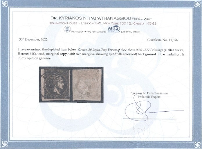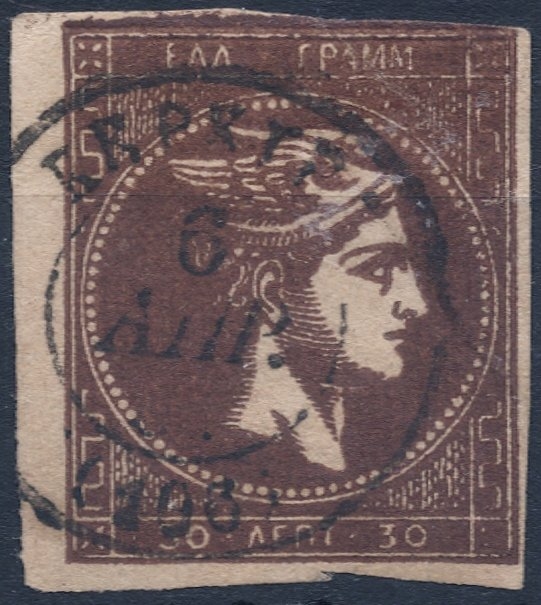 Lot0216 - ΕΛΛΑΔΑ 1876-1877 30 λεπτά καφέ βαθύ (deep brown), συνοδεύεται με πιστοποιητικό Παπαθανασίου ☉