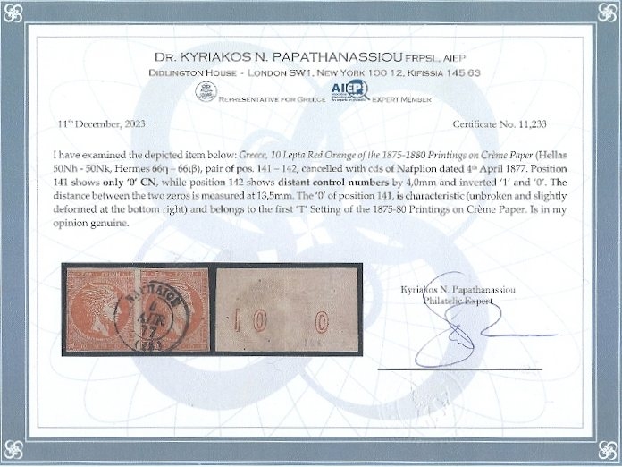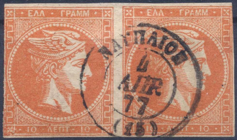 Lot0244 - ΕΛΛΑΔΑ 1875-1880 10 λεπτά κόκκινο πορτοκαλί (red orange), ζευγάρι, θέση πλάκας 141-142, συνοδεύεται με πιστοποιητικό Παπαθανασίου ☉/bl2
