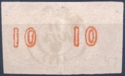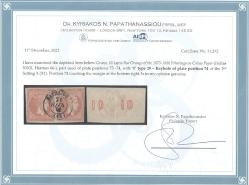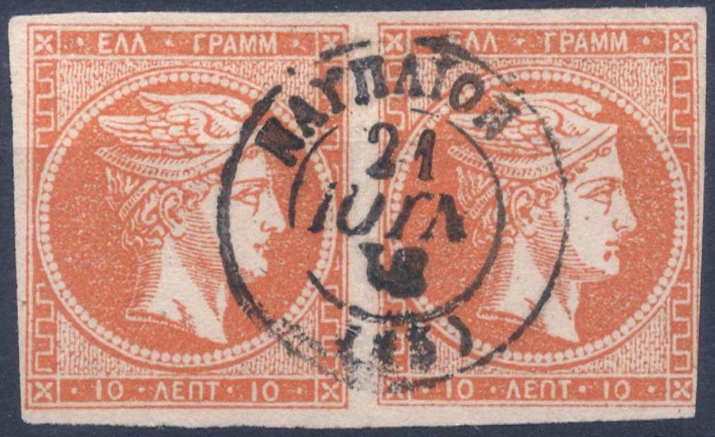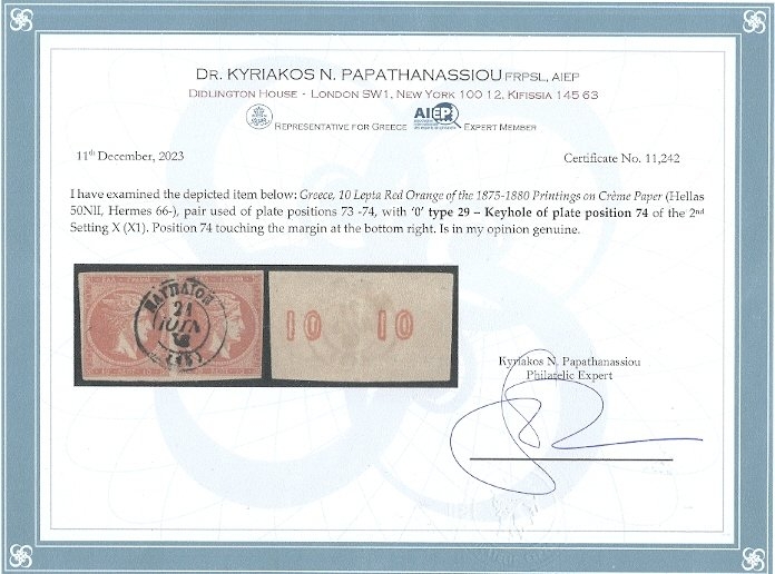Lot0245 - ΕΛΛΑΔΑ 1875-1880 10 λεπτά βαθύ κόκκινο-πορτοκαλί (deep red-orange), ζευγάρι, θέση πλάκας 73-74, στη θέση 74 '0' σε σχήμα κλειδαρότρυπας, συνοδεύεται με πιστοποιητικό Παπαθανασίου ☉/bl2