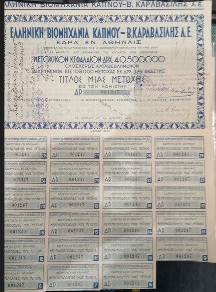 Lot2834 - Μετοχή Ελληνικής Βιομηχανίας Καπνού-Β Καραβασίλης ΑΕ, τίτλος μίας (1) μετοχής 24-4-1937