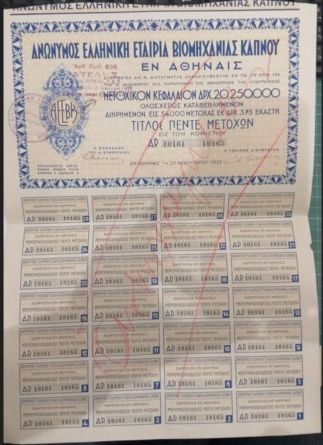 Lot2837 - Μετοχή Ελληνικής Βιομηχανίας Καπνού, τίτλος πέντε (5) μετοχών 25-2-1935