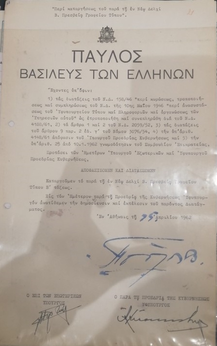 Lot2840 - Έγγραφο υπογεγραμμένο από τον Βασιλέα Παύλο και τον Υπουργό Εξωτερικών Ευάγγελου Αβέρωφ για την κατάργηση του γραφείου τύπου τις Β. Πρεσβείας του Ν. Δελχί, 5 Απριλίου 1962