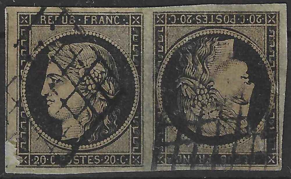 Lot1761 - Γαλλία 1849-1850, 20 cent ζευγάρι μαύρο με διαφάνεια, κατάλογος Yvert No 3d ☉/bl2