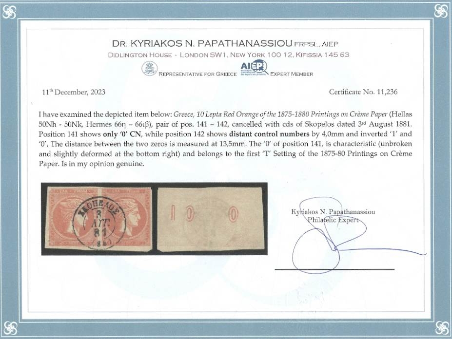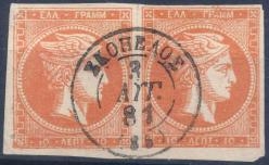 Lot0243 - ΕΛΛΑΔΑ 1875-1880 10 λεπτά κόκκινο πορτοκαλί (red orange), ζευγάρι στο ένα απέχοντες ΑΕ και στο άλλο 0 αντί για 10 θέση πλάκας 141-142, συνοδεύεται με πιστοποιητικό Παπαθανασίου ☉/bl2