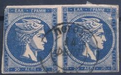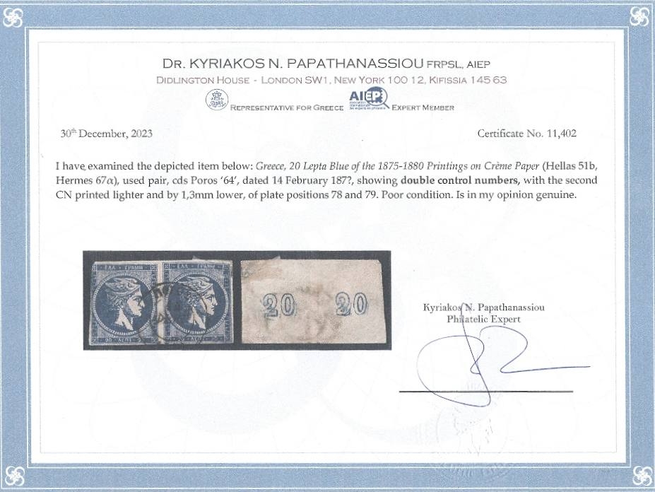 Lot0257 - ΕΛΛΑΔΑ 1875-1880 20 λεπτά μπλε (shades) με διπλό ΑΕ, θέσεις πλάκας 78, 79, συνοδεύεται με πιστοποιητικό Παπαθανασίου ☉/bl2