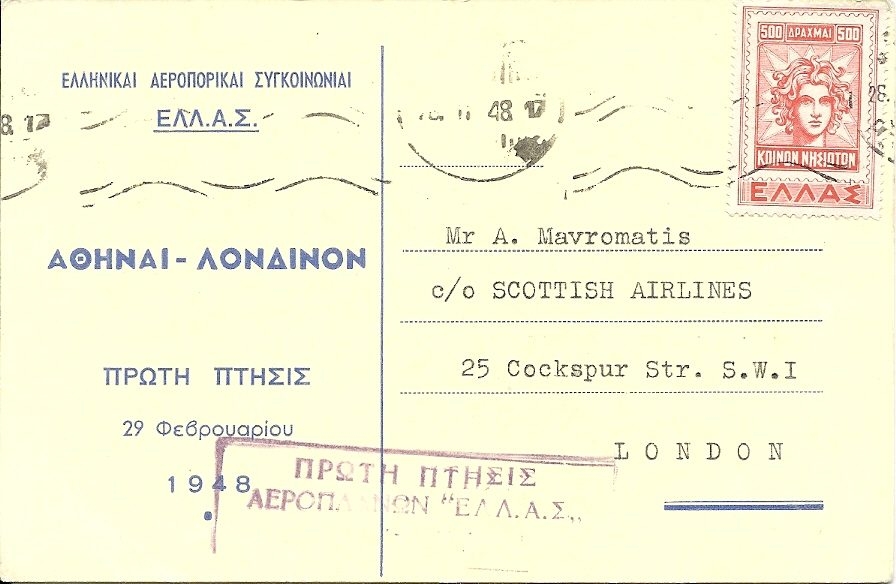 Lot1372 - ΕΛΛΑΔΑ 1948, πρώτη πτήση Αθήνα - Λονδίνο από την ΕΛΛΑΣ (Ελληνικαί Αεροπορικαί Συγκοινωνίαι)