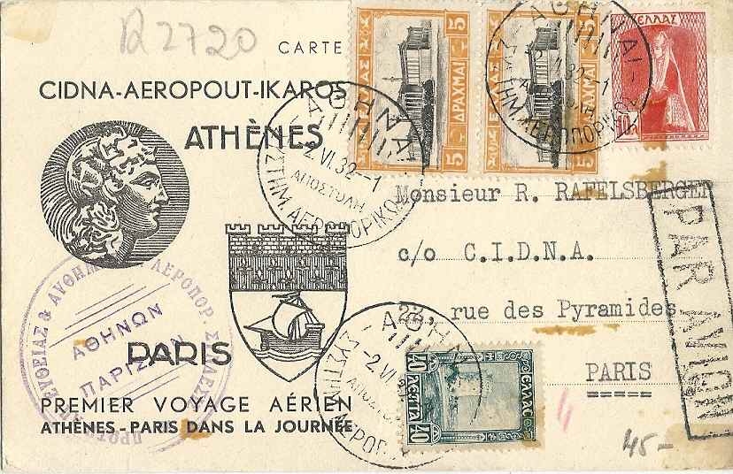 Lot1373 - ΕΛΛΑΔΑ 1932, πρώτη πτήση Αθήνα -Παρίσι 2-6-1932 με την εταιρεία CIDNA - AEROPOUT - IKAROS