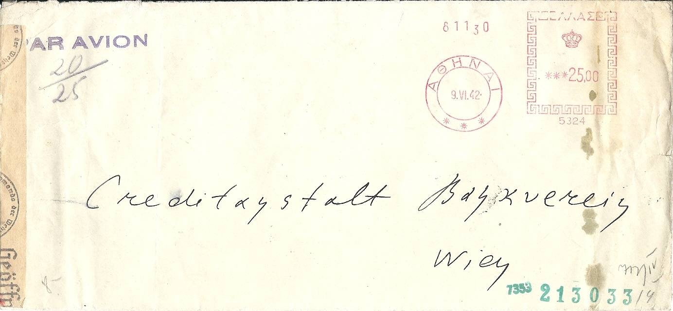 Lot1374 - ΕΛΛΑΔΑ 1942, επιστολή Τραπέζης της Ελλάδος Αθήνα προς Βιέννη, Αυστριακή λογοκρισία