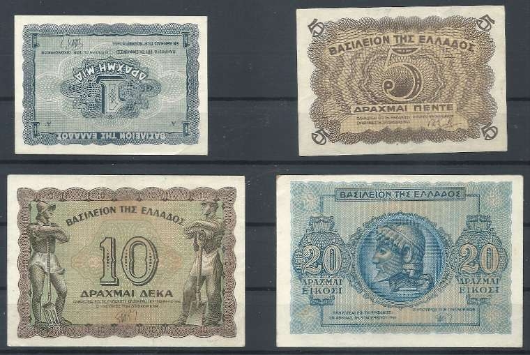 Lot2332 - ΕΛΛΑΔΑ 1944-1945, Βασίλειον της Ελλάδος Νέες Χώρες, σετ 4 χαρτονομισμάτων 1 - 5 10 -20 δραχμές.