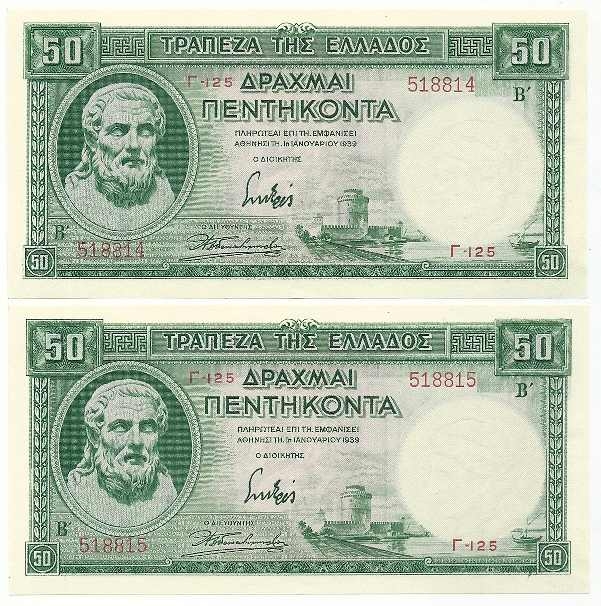 Lot2313 - ΕΛΛΑΔΑ 50 δραχμές 1-1-1939, δύο συνεχόμενα νούμερα, αριθμός καταλόγου Πιτίδη - Στρατουδάκη : 106