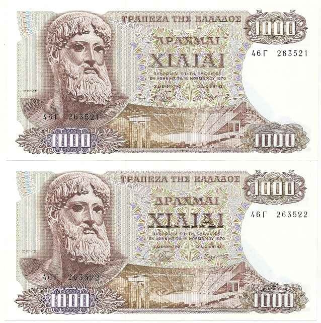 Lot2314 - ΕΛΛΑΔΑ 1.000 δραχμές 1-11-1970, δύο συνεχόμενα νούμερα, αριθμός καταλόγου Πιτίδη - Στρατουδάκη : 185