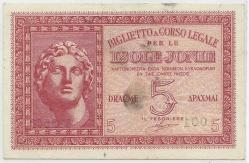 Lot2321 - ΕΛΛΑΔΑ Ιταλική Κατοχή 1941 5 δραχμές με τον Μέγα Αλέξανδρο, αριθμός καταλόγου Πιτίδη - Στρατουδάκη : 347