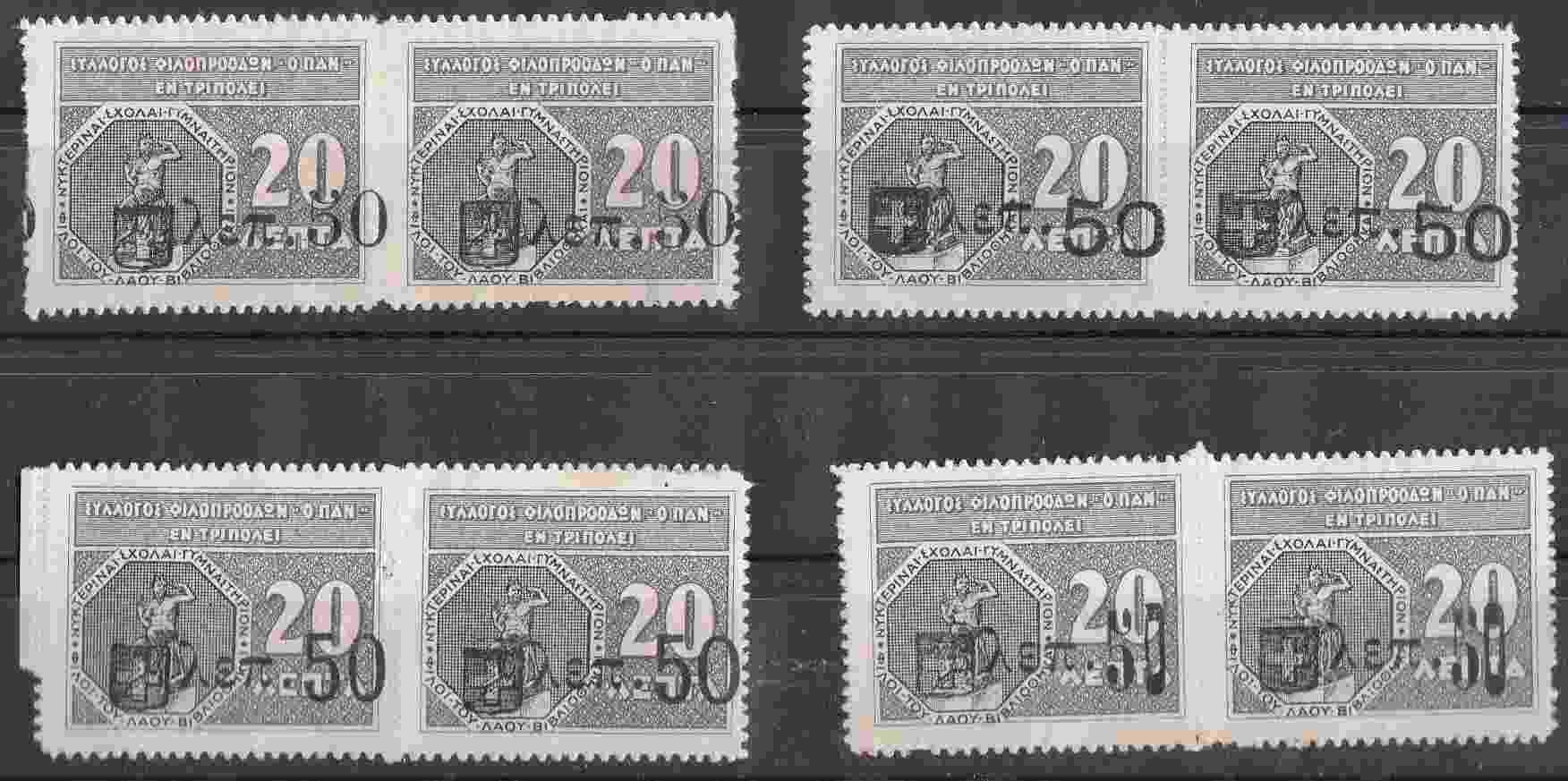 Lot1182 - ΕΛΛΑΔΑ, 4 ζεύγη με ποικιλίες επισήμανσης 20λ/50λ, Τρίπολη Σύλλογος Φιλοπροόδων ο 'ΠΑΝ