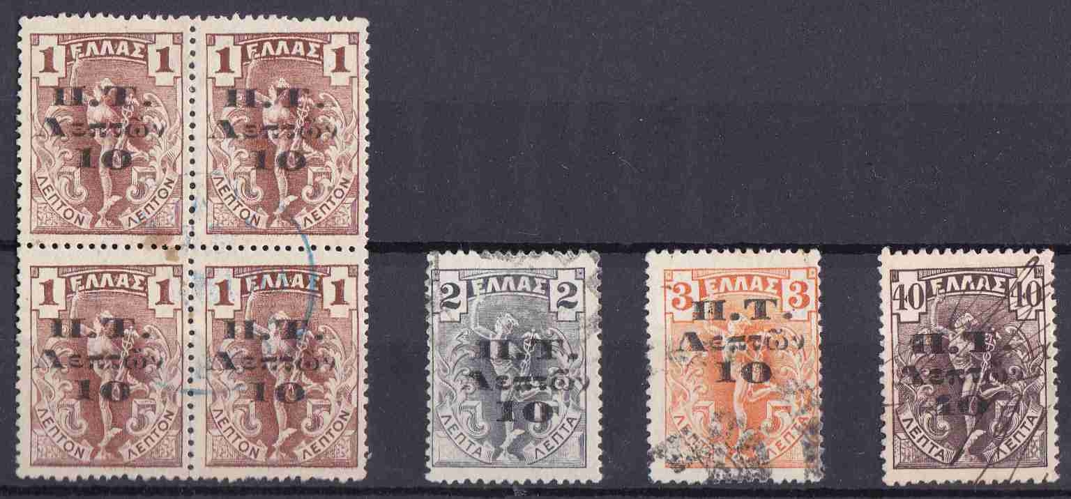 Lot0517 - ΕΛΛΑΔΑ 1913, 7 ένσημα ιπτάμενου Ερμή με επισήμανση ΠΤ νέων αξιών, συμπληρωματικός φόρος ΠΤ