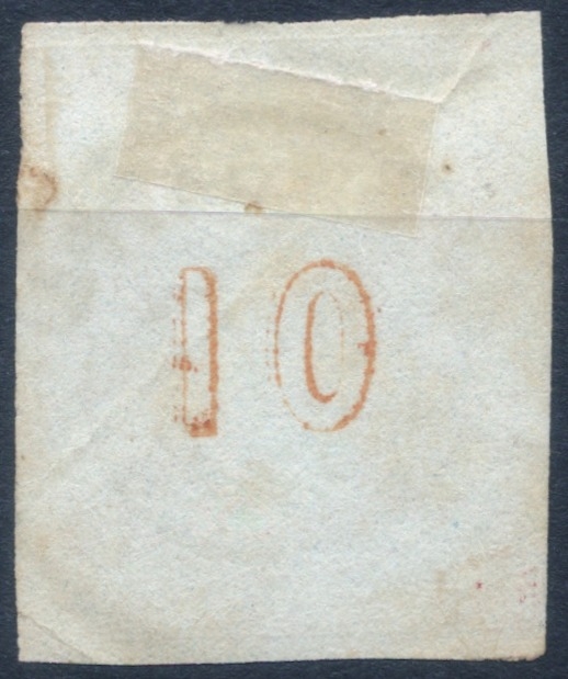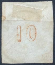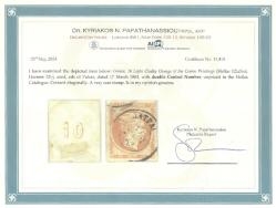 Lot0036 - ΕΛΛΑΔΑ 1861-1862 10 λεπτά ωχρό κίτρινο πορτοκαλί (ochre orange) με σφραγίδα Πάτρα 17-3-1863 με διπλό αριθμό ελέγχου με μικρή τσάκιση, συνοδεύεται με πιστοποιητικό Παπαθανασίου ☉