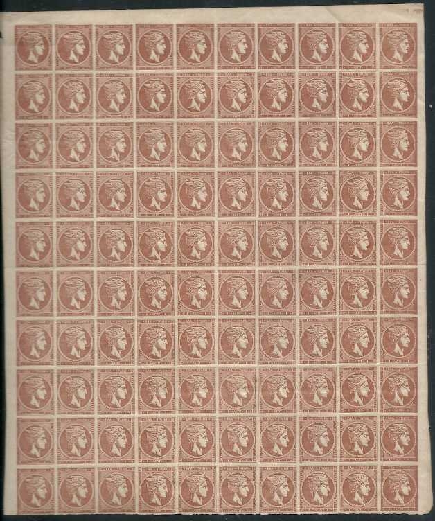 Lot0277 - ΕΛΛΑΔΑ 1880-1886 1 λεπτό καφεκόκκινο (red brown) σε κομμάτι φύλλου των 100 τεμαχίων, θέσεις πλάκας 1-100 *