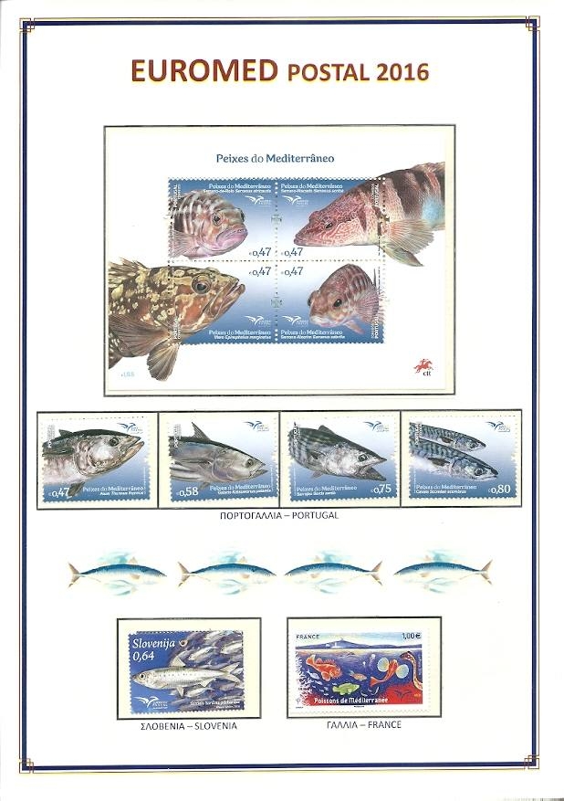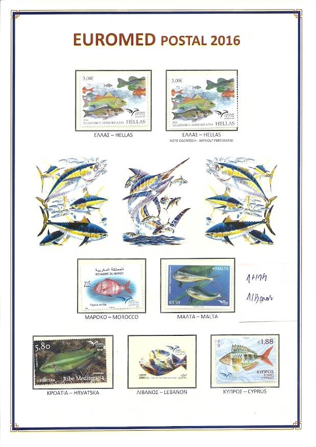 Lot0762 - ΕΛΛΑΔΑ 2016 EUROMED POSTAL, 3 εικονογραφημένα φύλλα με 23 γραμματόσημα από 9 χώρες, λείπει το γραμματόσημο από το Λίβανο **