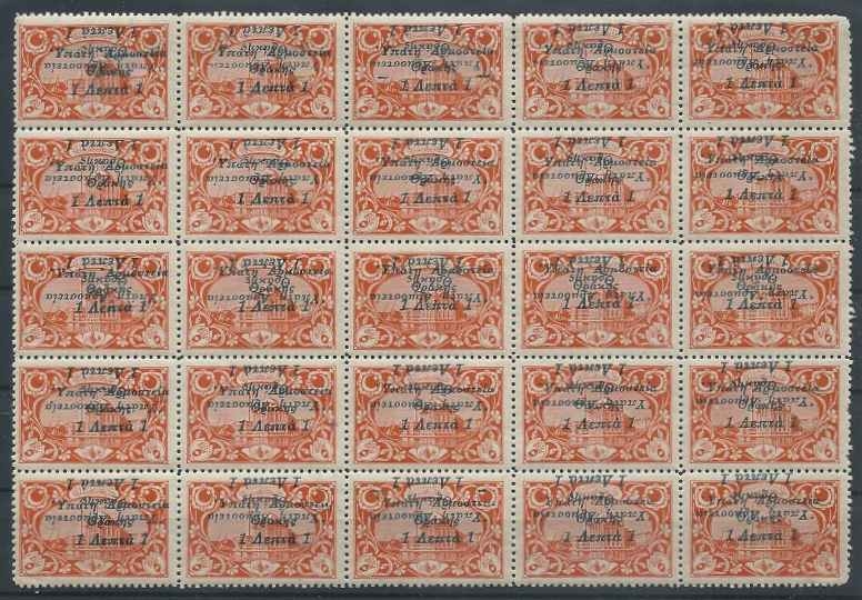 Lot0912 - ΕΛΛΑΔΑ 1920 Νέες Χώρες, Θράκη με επισήμανση 'Υπατη Αρμοστεία Θράκης με διπλή επισήμανση, η μία ανεστραμμένη, 25άδα **/bl25