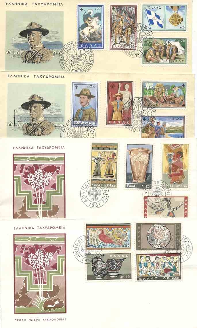 Lot1036 - ΕΛΛΑΔΑ ΦΠΗΚ λαχνός με 3 διαφορετικούς φακέλλους, 1960 Πρόσκοποι, Ολυμπιακοί αγώνες Ρώμης, 1961 Μινωική ✉