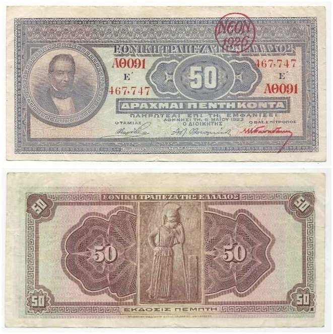 Lot2308 - ΕΛΛΑΔΑ 50 δραχμές 6-5-1923, με επισήμανση ΝΕΟΝ 1926, αριθμός καταλόγου Πιτίδη - Στρατουδάκη : 80