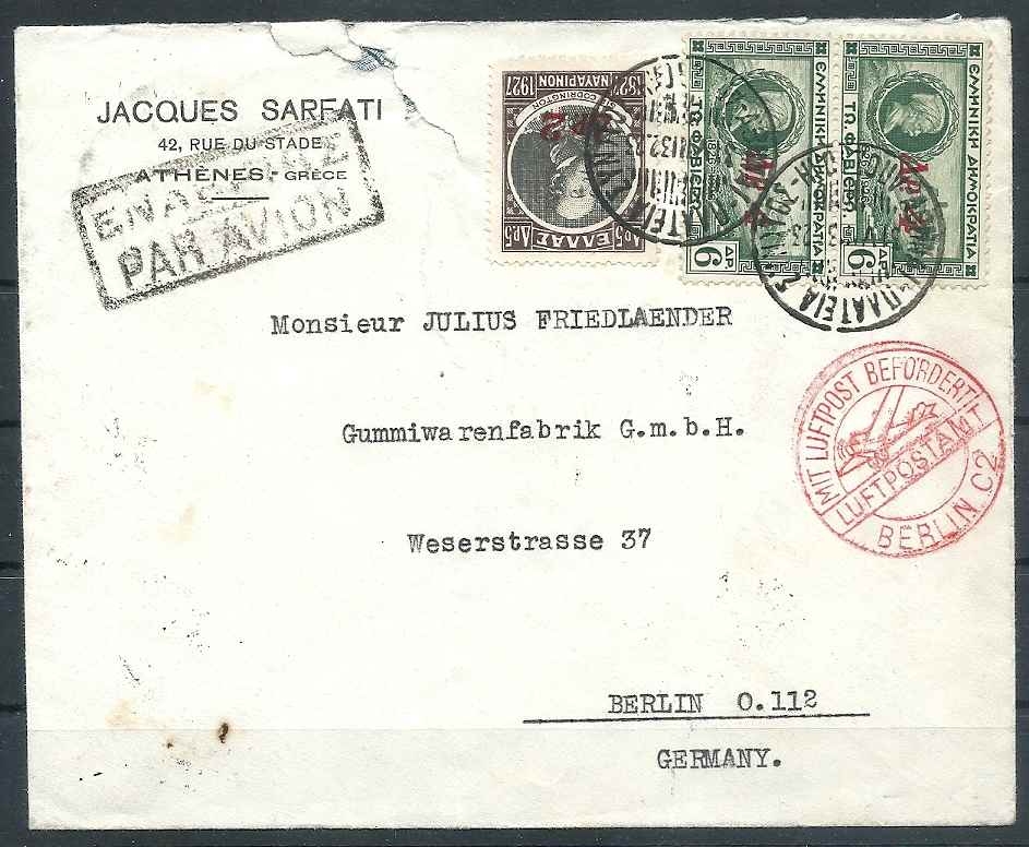 Lot1362 - ΕΛΛΑΔΑ, φακελλος 31-5-32 από Αθήνα Πλατεία Συντάγματος προς Βερολίνο με κόκκινη σφραγίδα LUFTPOSTAMT