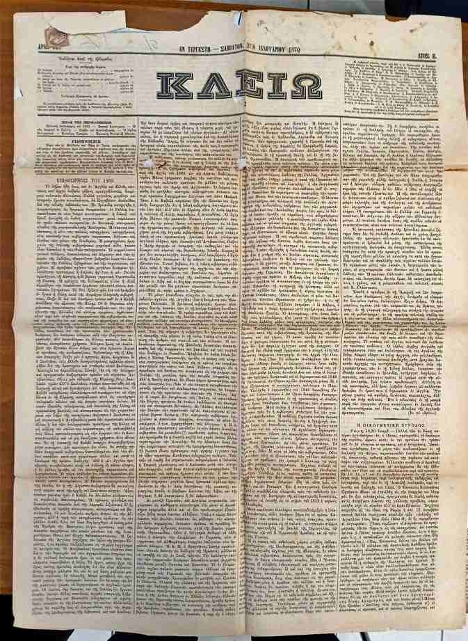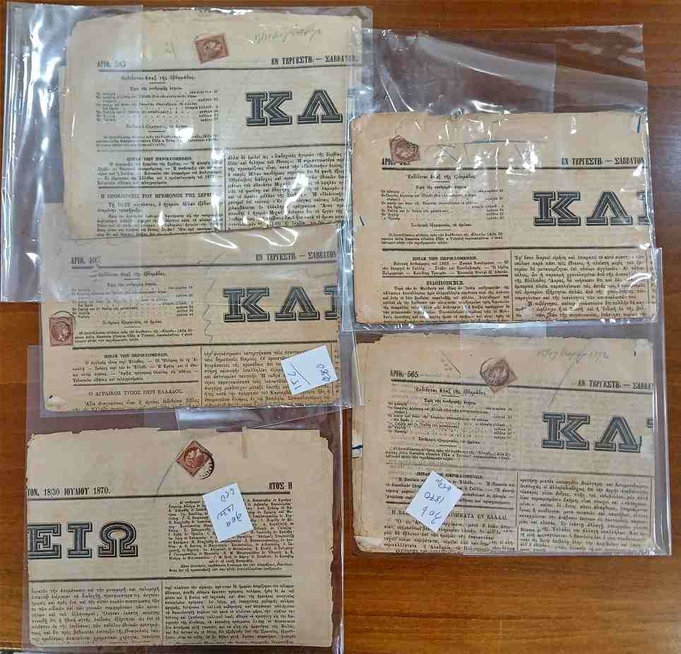 Lot2676 - Συλλογή 5 εφημερίδων 'ΚΛΕΙΩ' με έκδοση Τεργέστης ταχυδρομημένες με 1 λεπτό Μεγάλης Κεφαλής και ημερομηνίες : Απρίλιος 1869 - Ιανουάριος 1870 - Ιούλιος 1870 - Απρίλιος 1872 - Αύγουστος 1872,