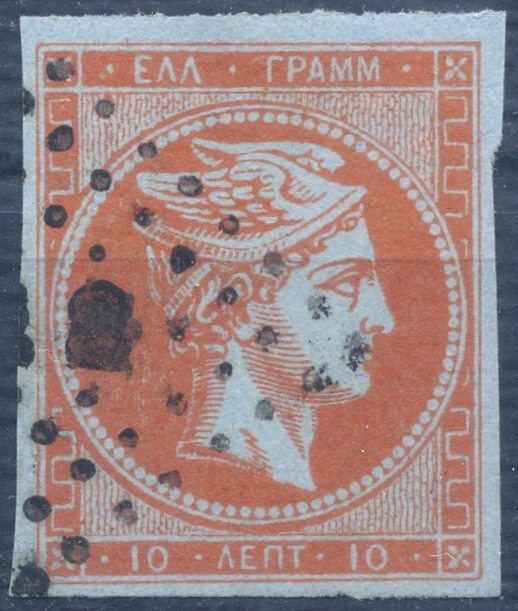 Lot0090 - ΕΛΛΑΔΑ 1862-1867 10 λεπτά κίτρινο πορτοκαλί σε μπλε (yellow orange on blue), με μετατοπισμένο αριθμό ☉