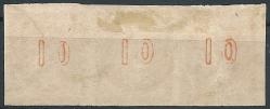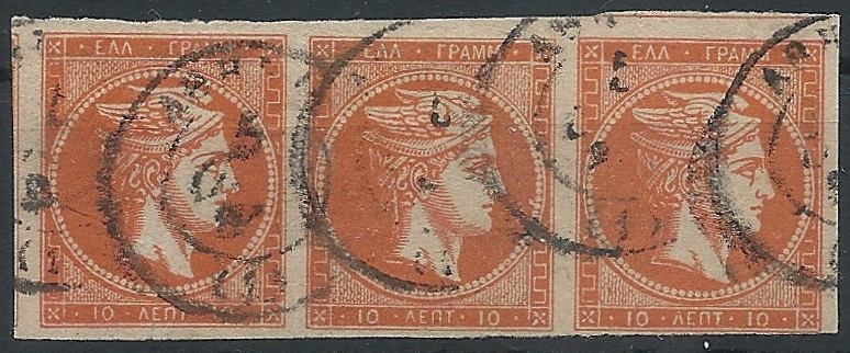 Lot0240 - ΕΛΛΑΔΑ 1875-1880 10 λεπτά κόκκινο-πορτοκαλί (red-orange) λωρίδα των τριών, σπάνιο με σφάλμα ανάποδο '0' και στα τρία και σφάλμα πλάκας στη θέση 136 ☉/bl3