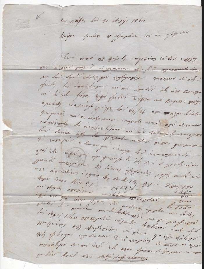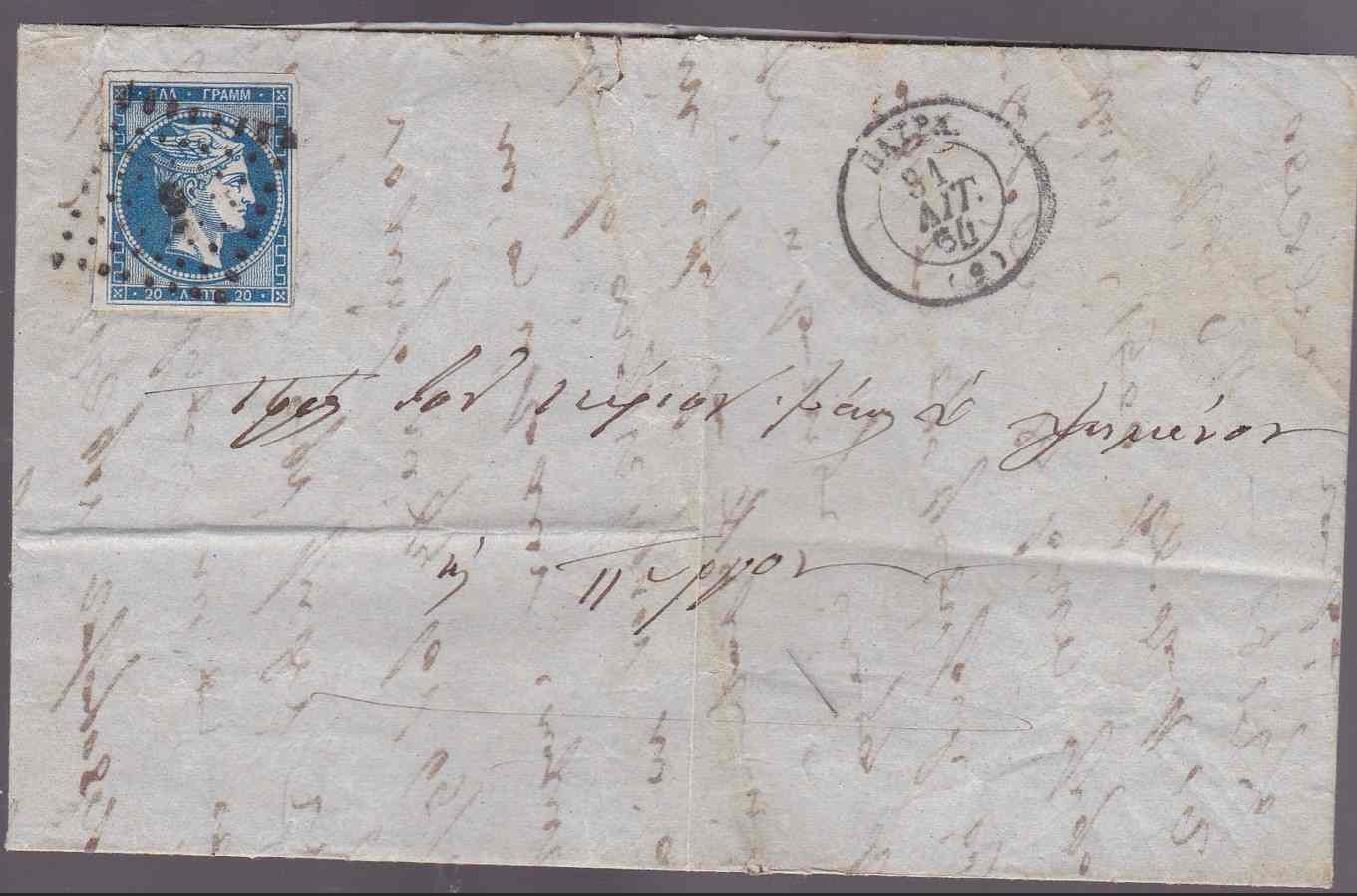 Lot0355 - ΕΛΛΑΔΑ 1864, επιστολή από Πάτρα προς Πύργο με 20λ κεφαλή Ερμή και στικτή Νο9 ✉