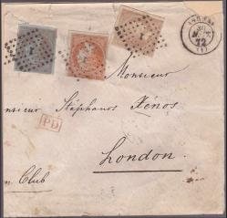 Lot0358 - ΕΛΛΑΔΑ 1872, τμήμα επιστολής από Αθήνα (στικτή σφραγίδα Νο 1) προς Λονδίνο με κεφαλές Ερμή των 40λ-10λ-2λ ✉