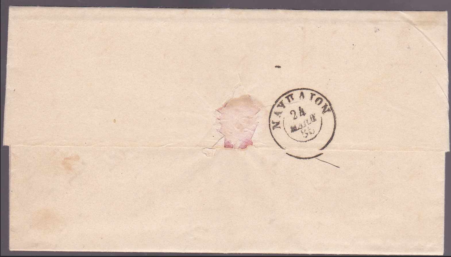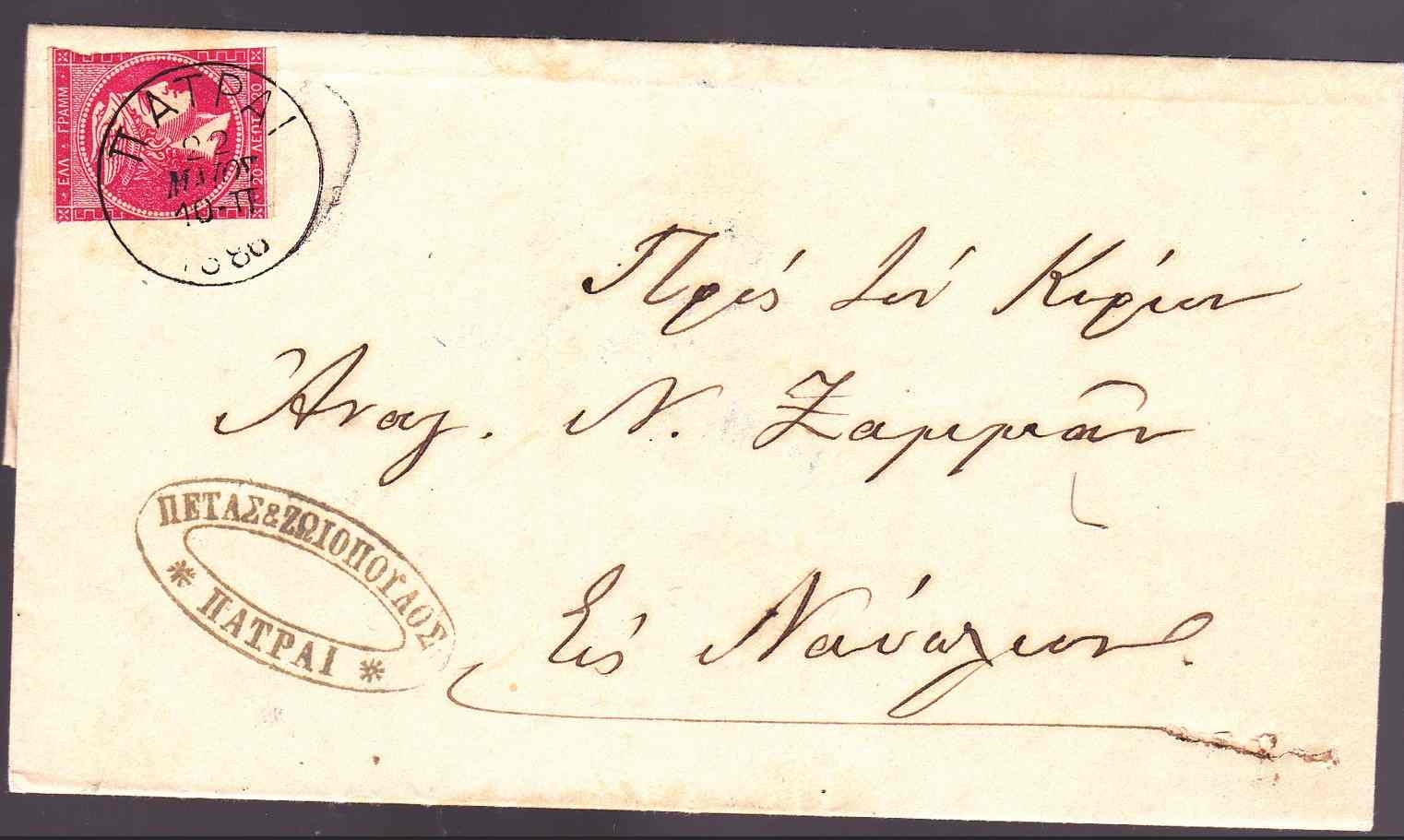 Lot0359 - ΕΛΛΑΔΑ, επιστολή από Πάτρα προς Ναύπλιο με κεφαλή Ερμή των 20λ ✉