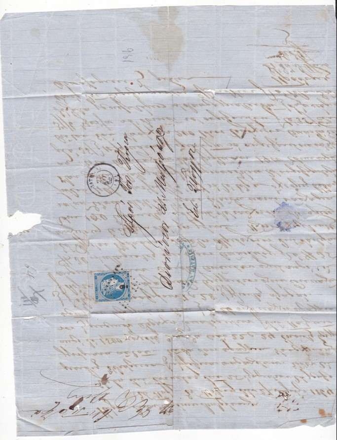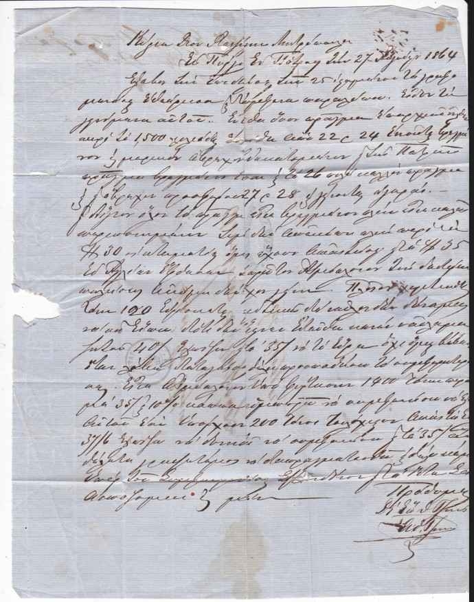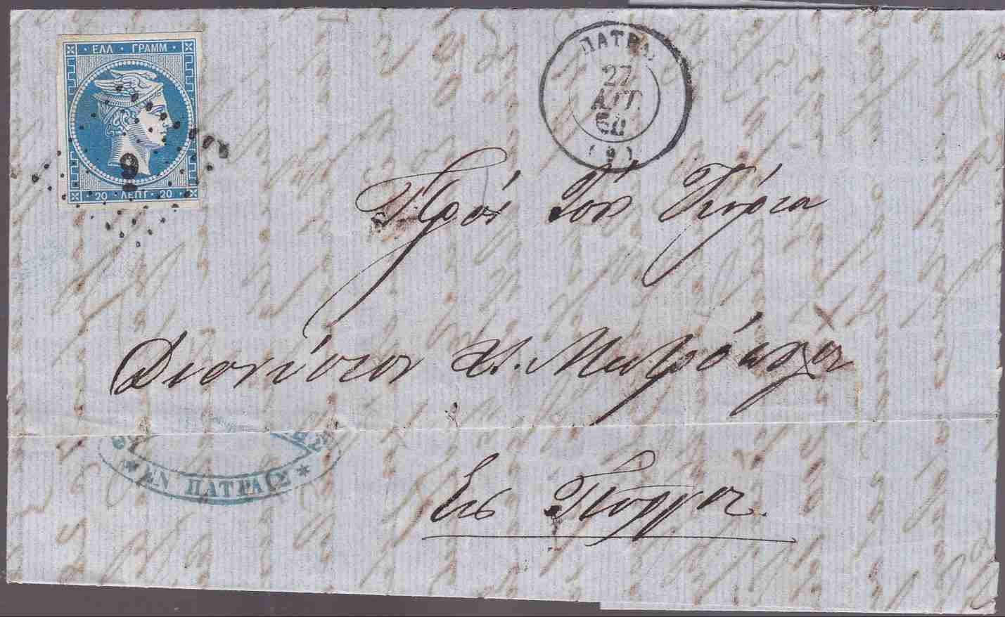 Lot0361 - ΕΛΛΑΔΑ 1864, επιστολή από Πάτρα προς Πύργο με κεφαλή Ερμή των 20λ και στικτή σφραγίδα Νο9 ✉