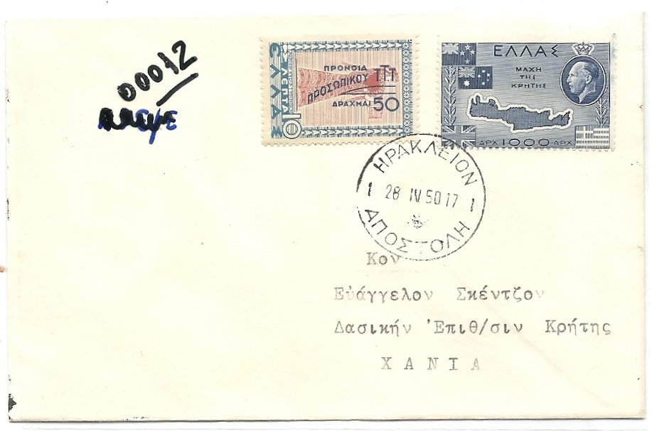 Lot1017 - ΕΛΛΑΔΑ 1950 ΦΠΗΚ έκδοση με τη Μάχη της Κρήτης ταχυδρομημένος προς Χανιά ✉