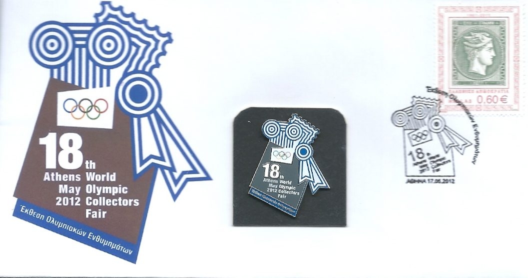Lot1094 - ΕΛΛΑΔΑ 2012 φάκελλος ανεπίσημος για την 18η Έκθεση Ολυμπιακών Ενθυμημάτων στην Αθήνα με αναμνηστικό pin ✉