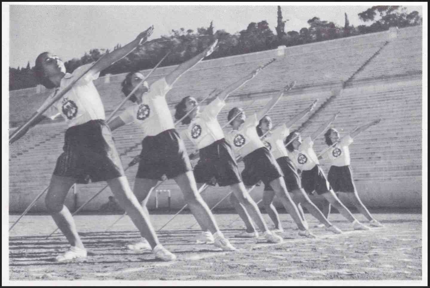 Lot1331 - ΕΛΛΑΔΑ 1940, δελτάριον 2 δρχ σειράς ΕΟΝ Φαλαγγίτισσαι ασκούμεναι εις τον ακοντισμόν, στη οποισθίαν όψη 2 τύποι σφραγίδων Ολυμπίας (1961).