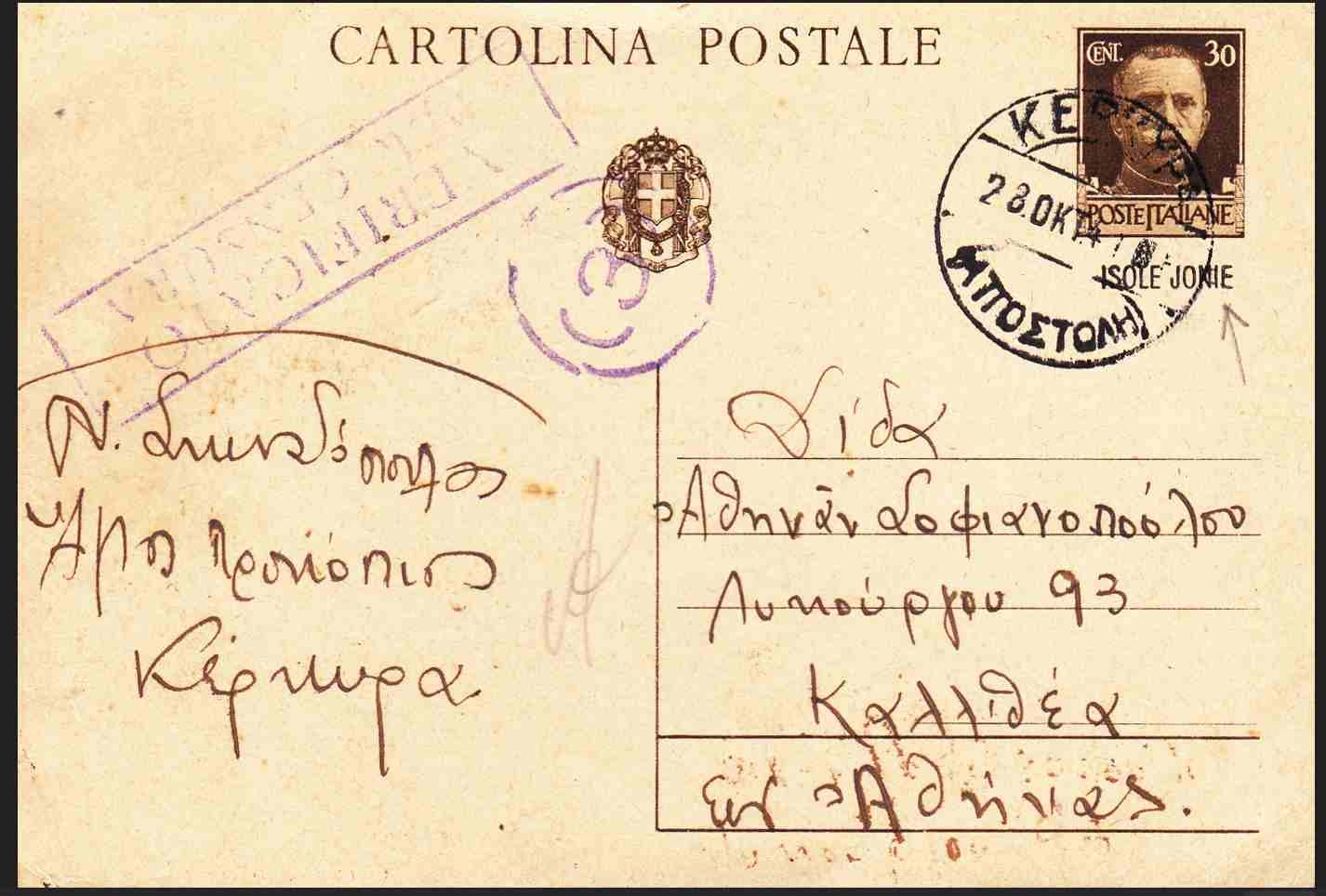 Lot1334 - ΙΟΝΙΑ ΝΗΣΙΑ 1941-1942, Ιταλική Κατοχή, Ιταλικό δελτάριο 30c με μαύρη επισήμανση Isole Jome, ορθογώνια σφραγίδα Ιταλικής Λογοκρισίας, ταχυδρομημένος από Κέρκυρα προς Αθήνα.