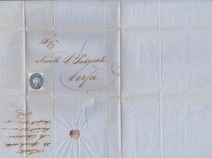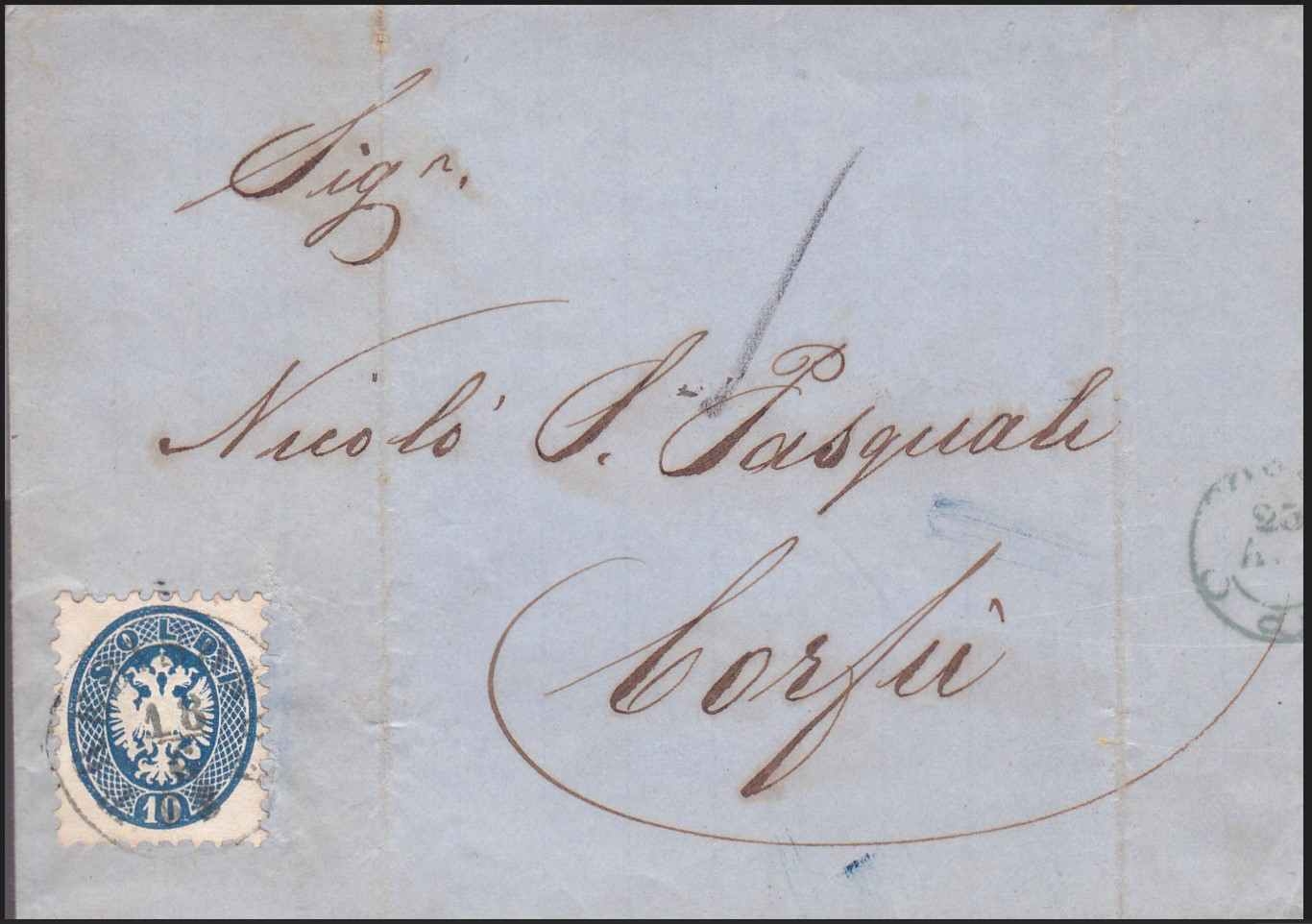 Lot1335 - ΚΕΡΚΥΡΑ 1863, προγραμματοσημική επιστολή από Τριέστη προς Κέρκυρα με 10 soldi (Lombardy-Venetto)