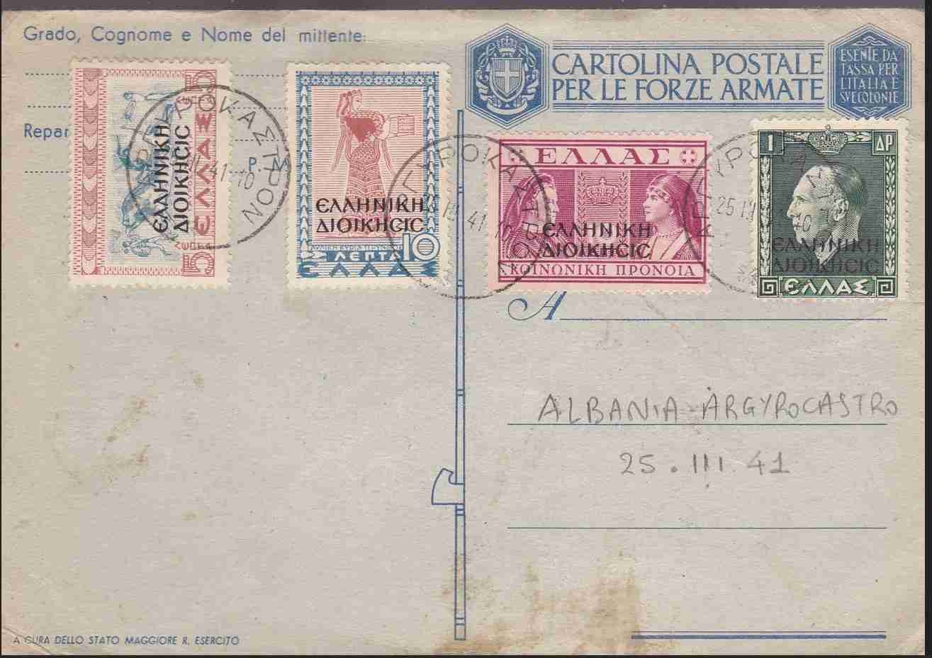 Lot1336 - ΙΤΑΛΙΚΟ στρατιωτικό Δελτάριο με 4 αξίες επισημασμένες με ΕΛΛΗΝΙΚΗ ΔΙΟΙΚΗΣΗ και σφραγίδες Αργυρόκαστρον.