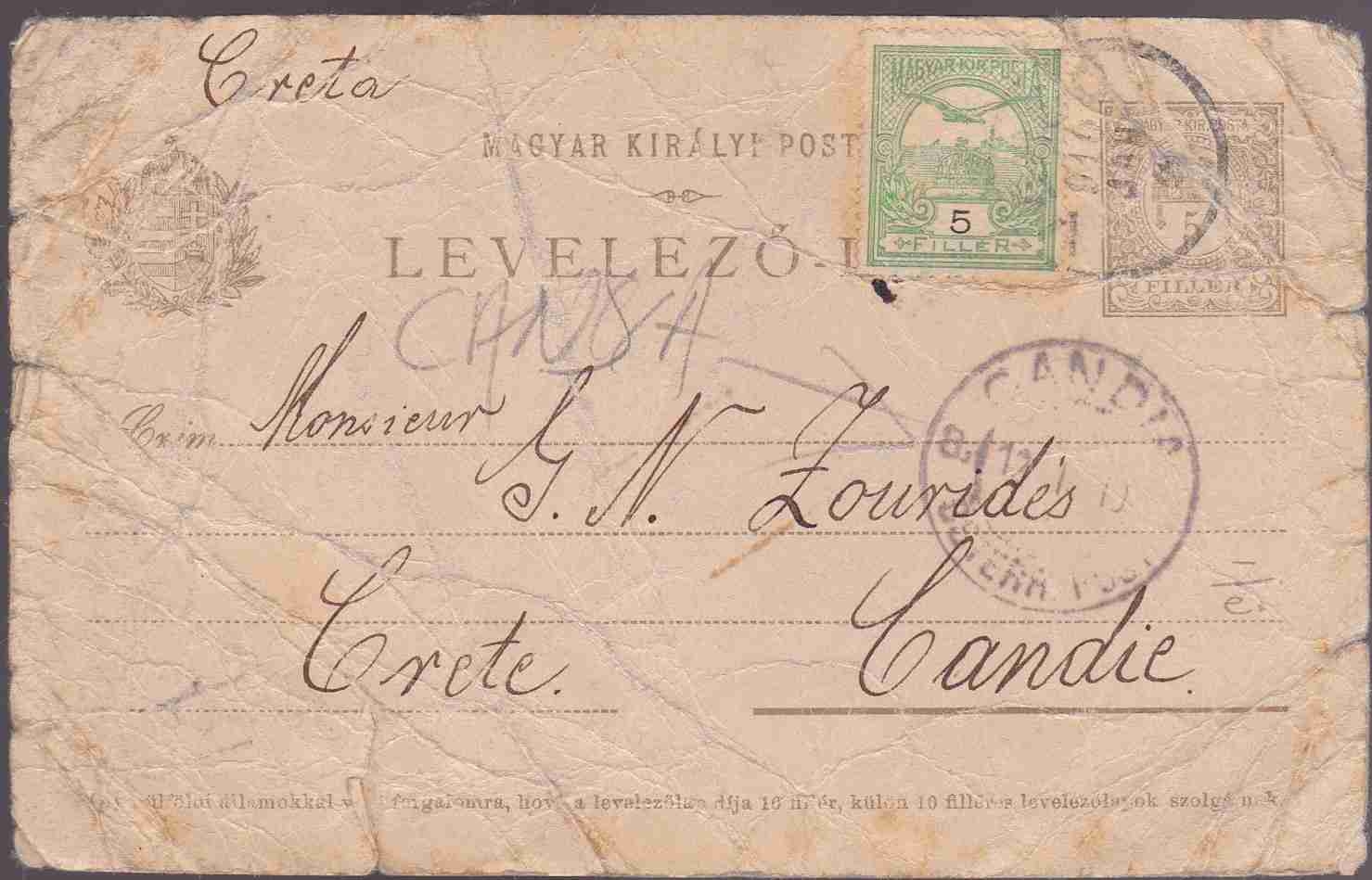 Lot1345 - ΚΡΗΤΗ 1910, Ουγγρικό επιστολικό Δελτάριο προς CANDIA (Ηράκλειο).