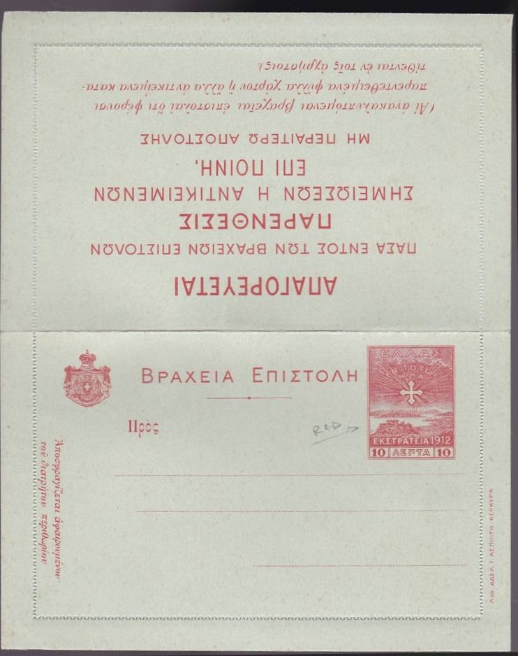 Lot1351 - ΕΛΛΑΔΑ 1913-1915, δισέλιδη βραχεία επιστολή με προτυπωμένο 10λ εκστρατείας σε άριστη κατάσταση, στη πίσω πλευρά σλόγκαν.