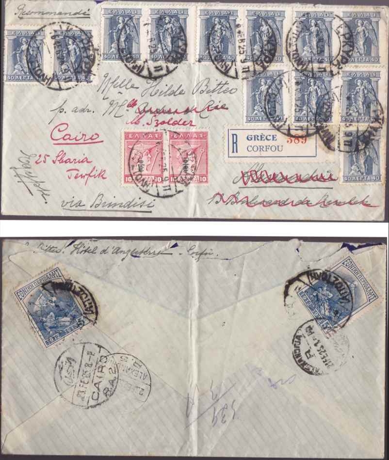 Lot1354 - ΕΛΛΑΔΑ 1925, συστημένος φάκελλος από Κέρκυρα προς Αλεξάνδρεια μέσω Brindizi, στην Αίγυπτο με νέα ταχυδρομική διεύθυνση και αποστολή στο Κάϊρο, στη πίσω όψη 2 Πρόνοιες (τραυματισμένος στρατιώ