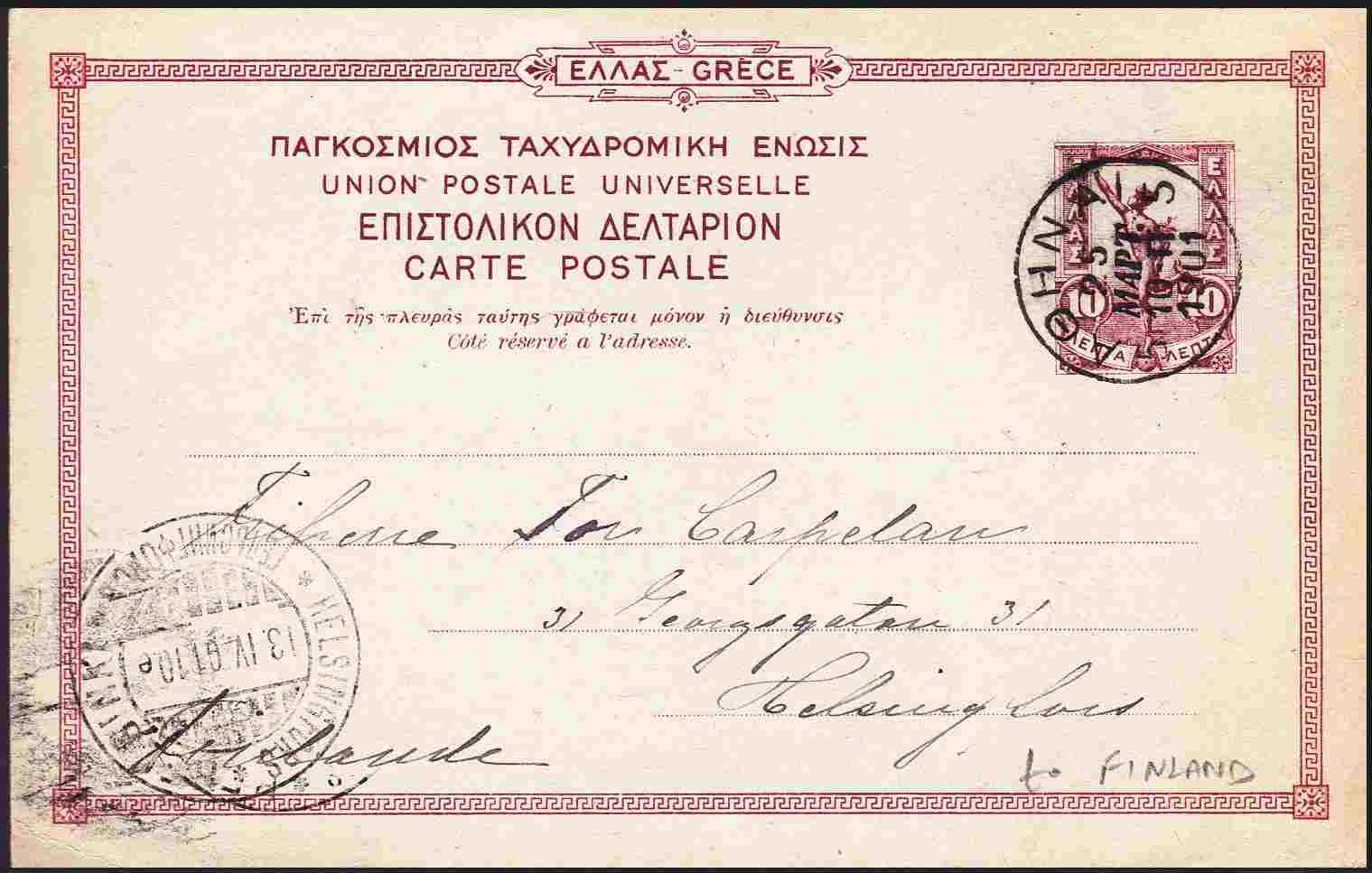 Lot1355 - ΕΛΛΑΔΑ, Δελτάριο 10λ Ιπτάμενου Ερμή προς Φινλανδία, σπάνιος προορισμός.