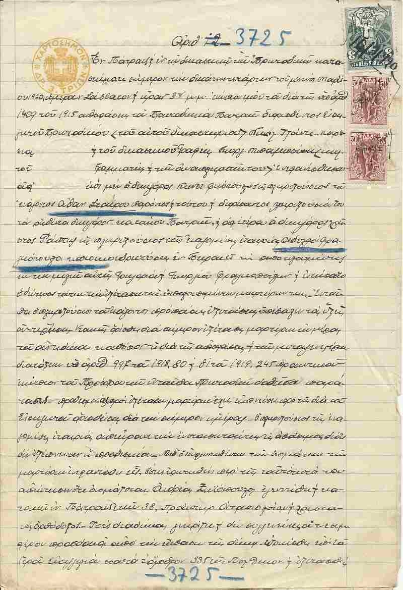 Lot1360 - ΕΛΛΑΔΑ 1917, Δικαστικό έγγραφο με υδατόσημο 'Ελληνικό Βασίλειο 1917' προπληρωμένο χαρτόσημο 3 δρχ & ζεύγος Ιπτάμενου Ερμή 50 λεπτά με επισήμανση ΘΕΜΙΣ