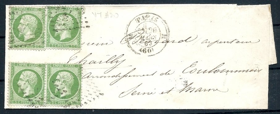 Lot1764 - Γαλλία 1862, φάκελλος ταχυδρομημένος 5 λεπτά με δύο ζευγάρια, ελεγμένα από οίκο JFB, κατάλογος Yvert : No 20 ✉